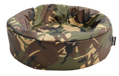 Bia Bädd med kamoflagemönster. För inom- och utomhusbruk, materialet är vattenavstötande och samma material finns i botten på bädden för att den ska kunna placeras på marken utan att polyetern suger upp fukt.