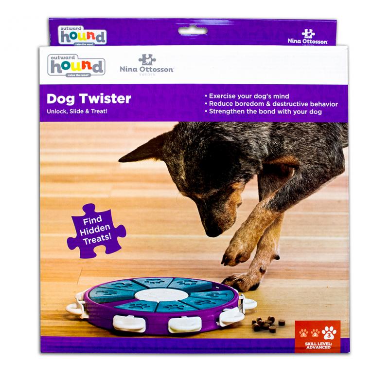 Hunden ska leta godis genom att flytta bricka efter bricka åt olika håll.