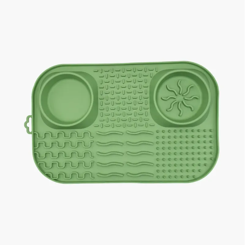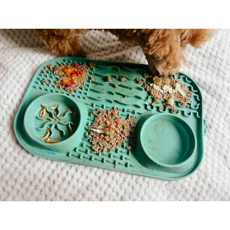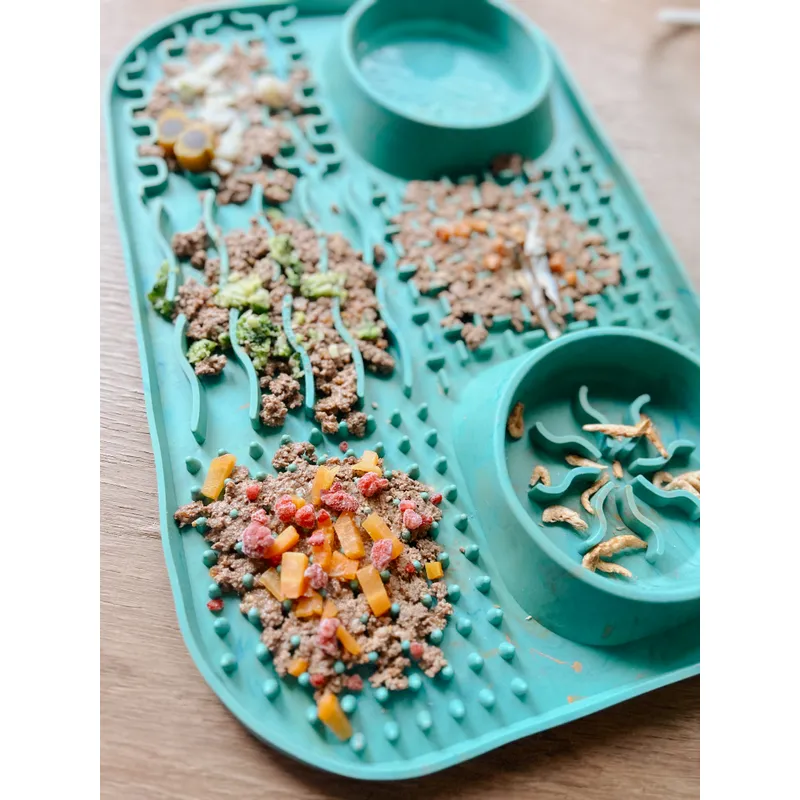 Fiboo’s roliga buffé-matta med två skålar och fyra olika slickytor. Den har olika texturer som uppmuntrar långsamt ätande och stimulerar hundar eller katter under måltiden. Perfekt för mindre hundraser och katter, och hjälper till att minska hetsätning samtidigt som det håller dem sysselsatta.