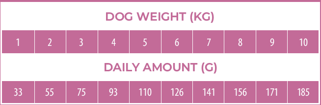 Fodret serveras torrt eller uppblött i vatten. Den rekommenderade dagliga givan hittar du i utfodringstabellen. Näringsbehovet kan variera beroende på ras, miljö, temperatur och din hunds aktivitetsnivå. Se till att din hund alltid har tillräckligt med färskt vatten.
