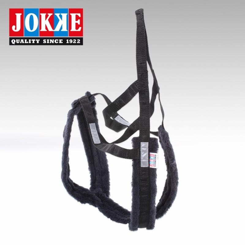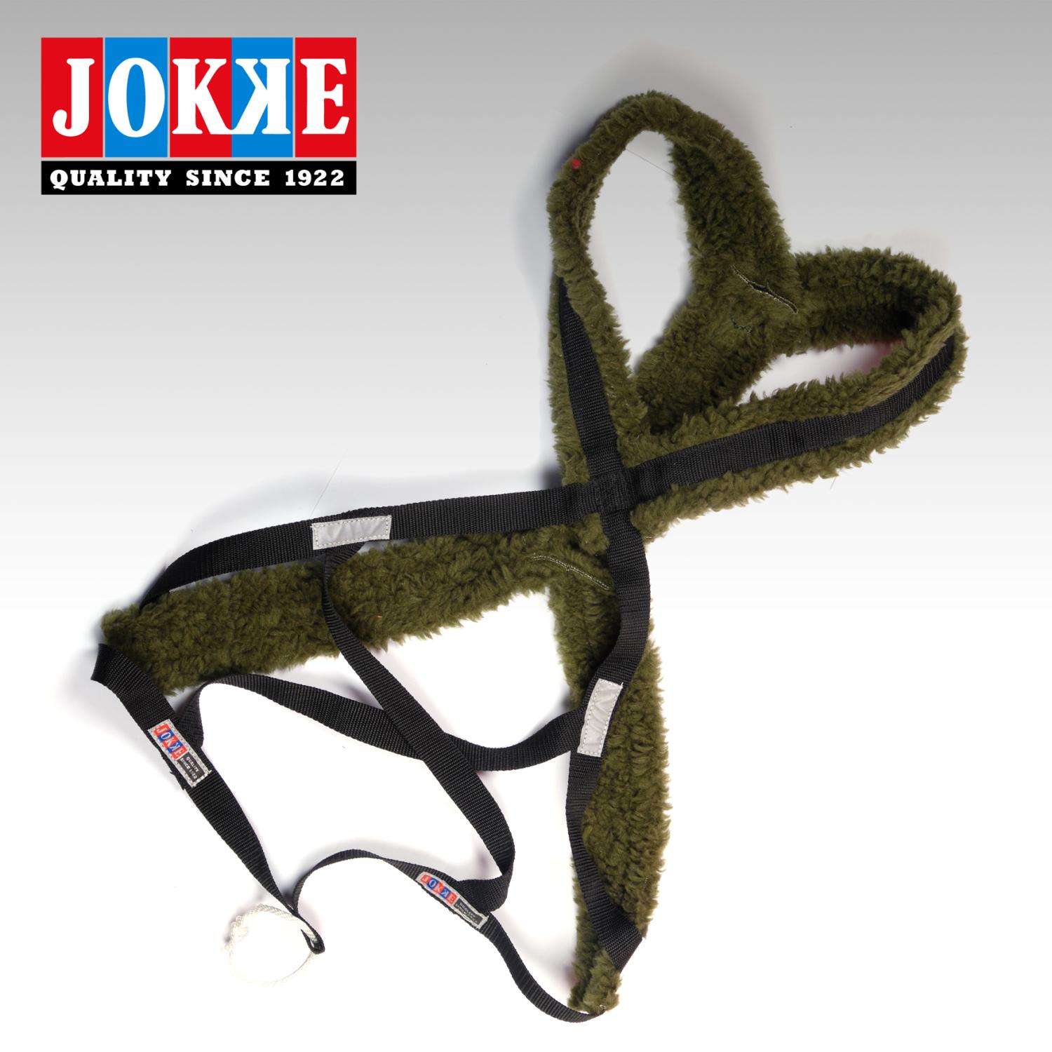 En teddy-fodrad dragsele. Tillverkad av starkt nylonband som fodrats med mörkgrönt teddymaterial. Reflexmärken på utsidan.