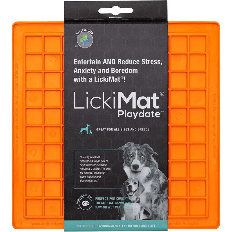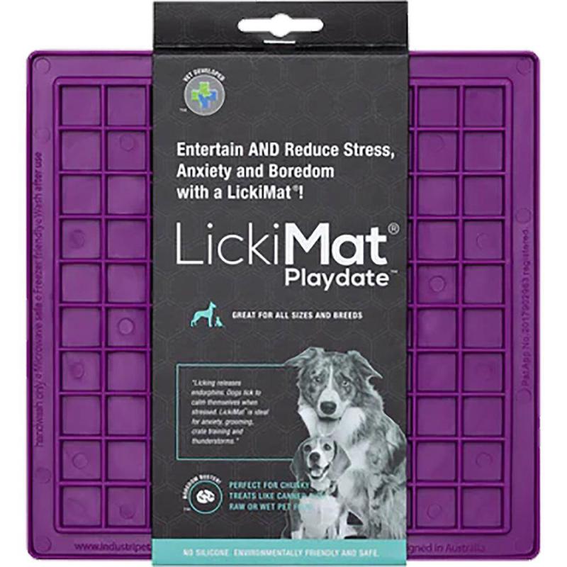 Lickimat är utvecklad för att förhindra tristess hos din katt eller hund. Bred ut djurets favoritmat på mattan så de får leta efter varje munsbit med tungan. Slickandet är lugnande för djuret och det ökar smaksinnet genom att djuret får njuta av en liten mängd mat. Mattan förhindrar överätning eftersom maten varar längre, den gör att djuret äter långsammare och främjar frisk andedräkt genom att bakterier och mat skrapas av tungan. Salivproduktionen stimuleras och hjälper till att rengöra tänder, tandkött och tunga. Tillverkad av giftfri TPR av livsmedelskvalitet. Kan frysas, diskas för hand. Lickimat Playdate har fyrkantiga fickor och är perfekt för stora bitar så som kött eller fisk.