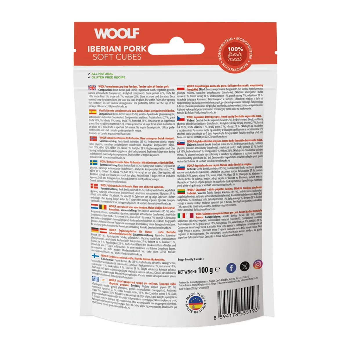 Woolf Soft Cubes Iberian Pork är ett exklusivt mjukt hundgodis med hela 85 % färskt kött från iberisk gris. Det är ett högkvalitativt protein med rik smak och god smältbarhet – framtaget utan spannmål eller onödiga tillsatser för att passa även känsliga hundar.